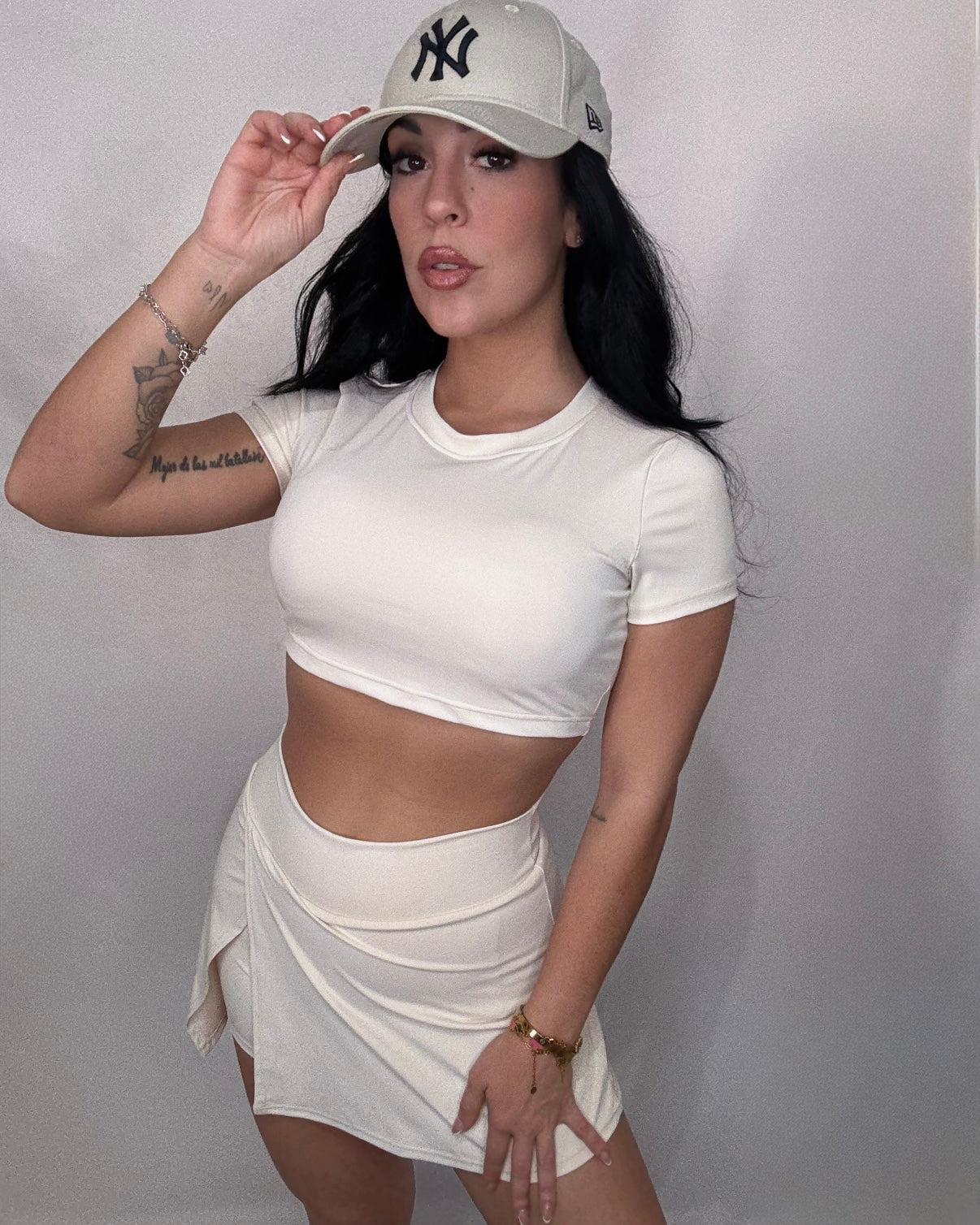 Conjunto deportivo de licra fría de alta calidad, compuesto por top de manga corta con cascos y escote cruzado en la espalda.