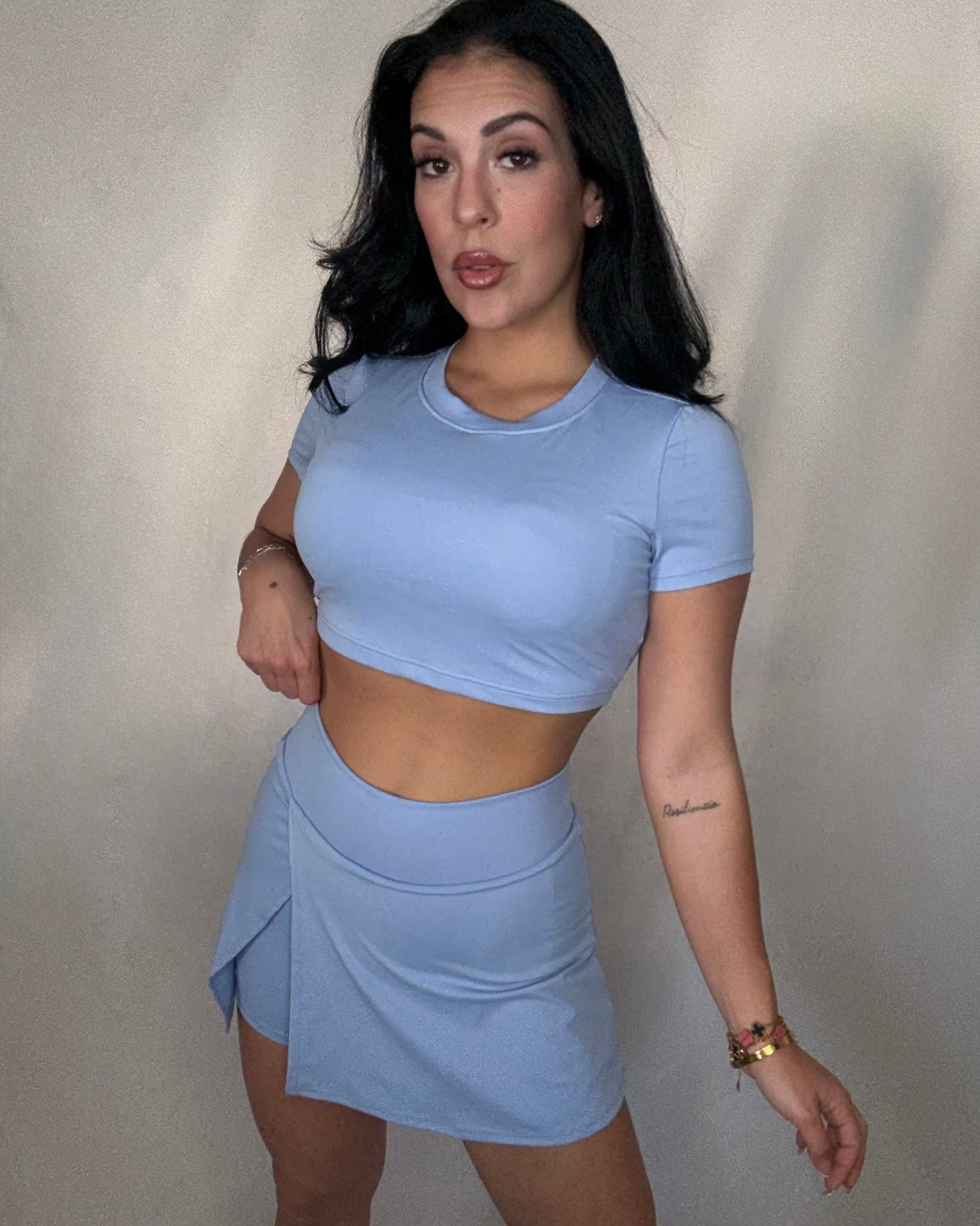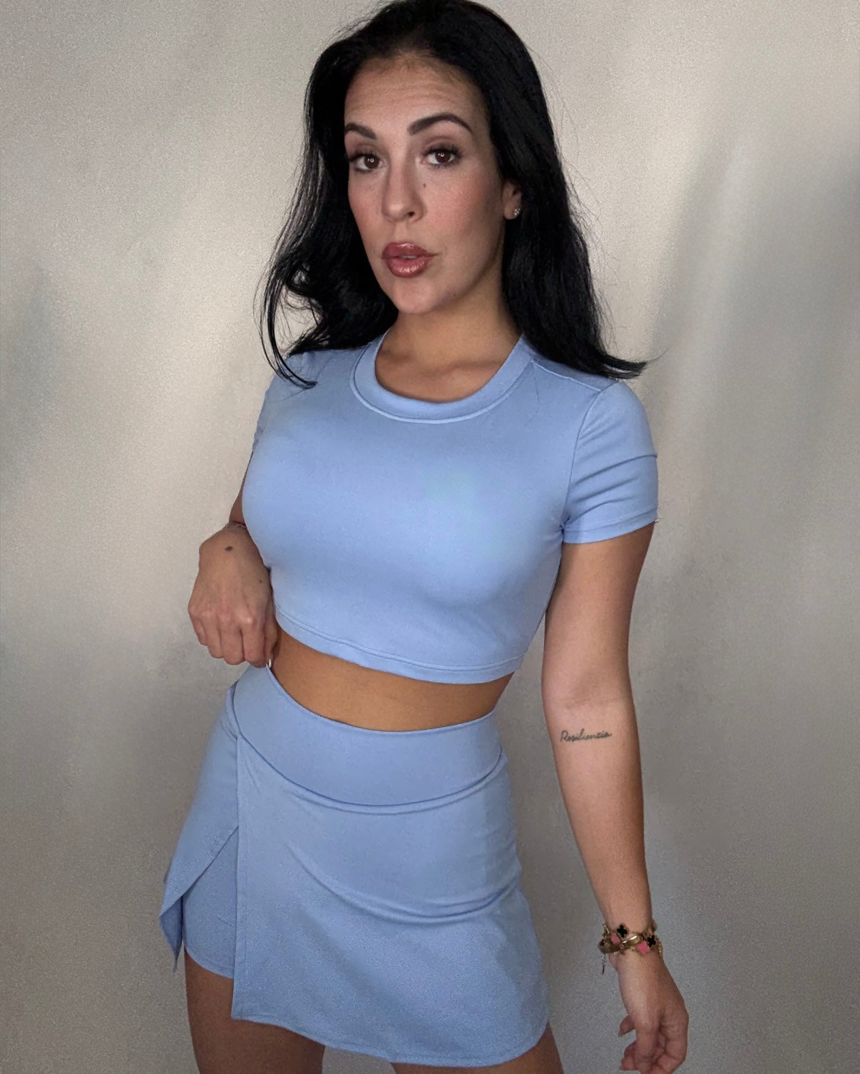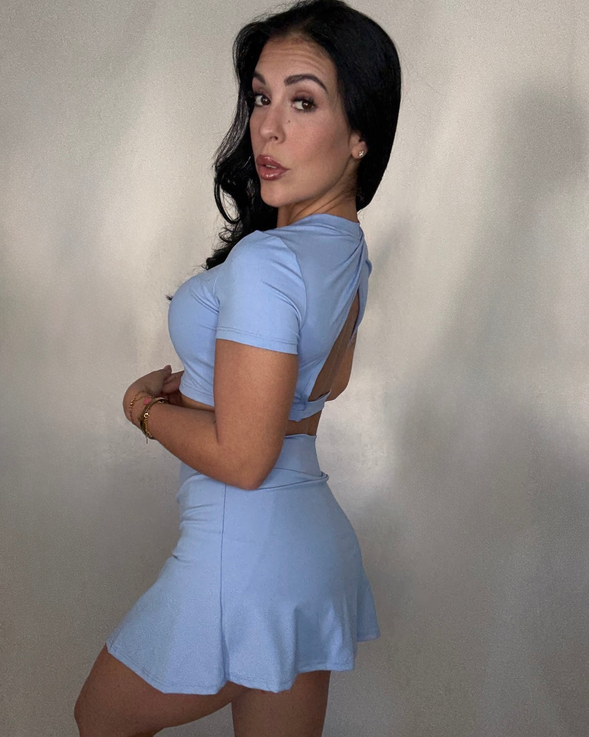 Conjunto deportivo de licra fría de alta calidad, compuesto por top de manga corta con cascos y escote cruzado en la espalda.