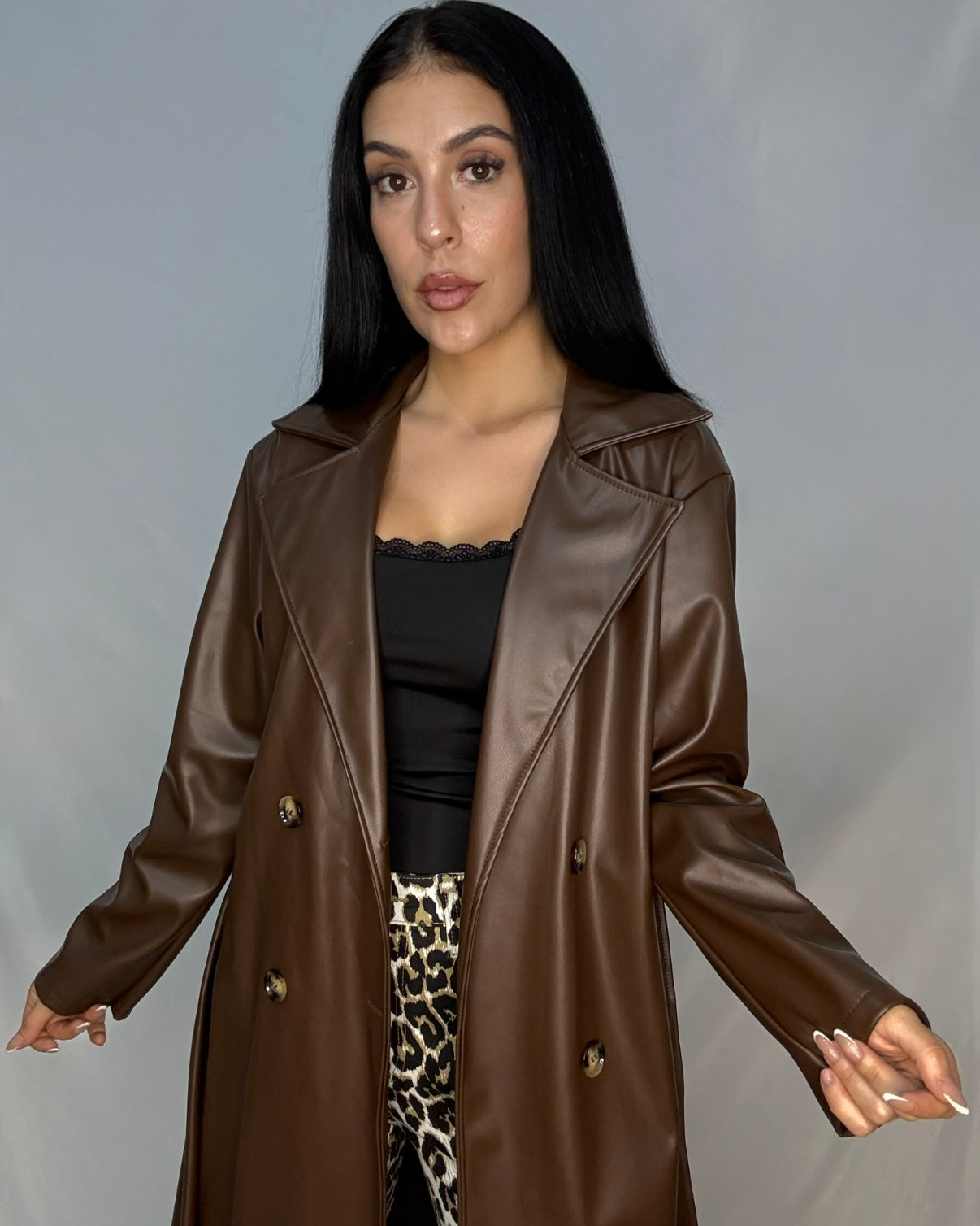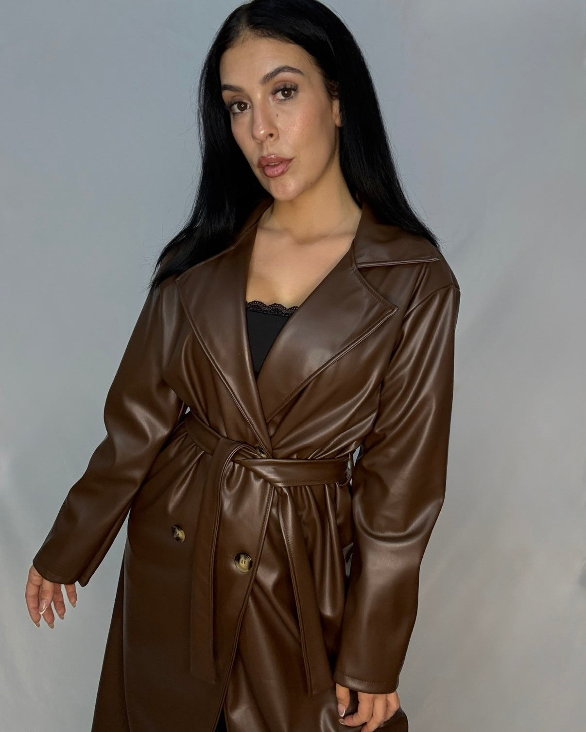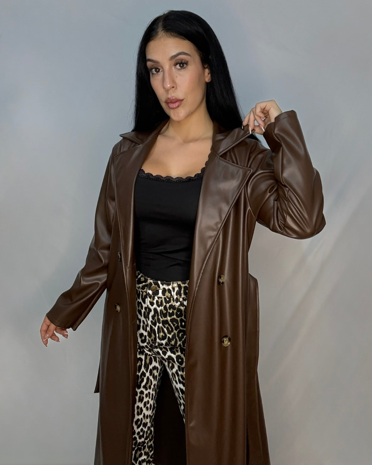 Gabardina de polipiel con cierre de botón y cinturón.