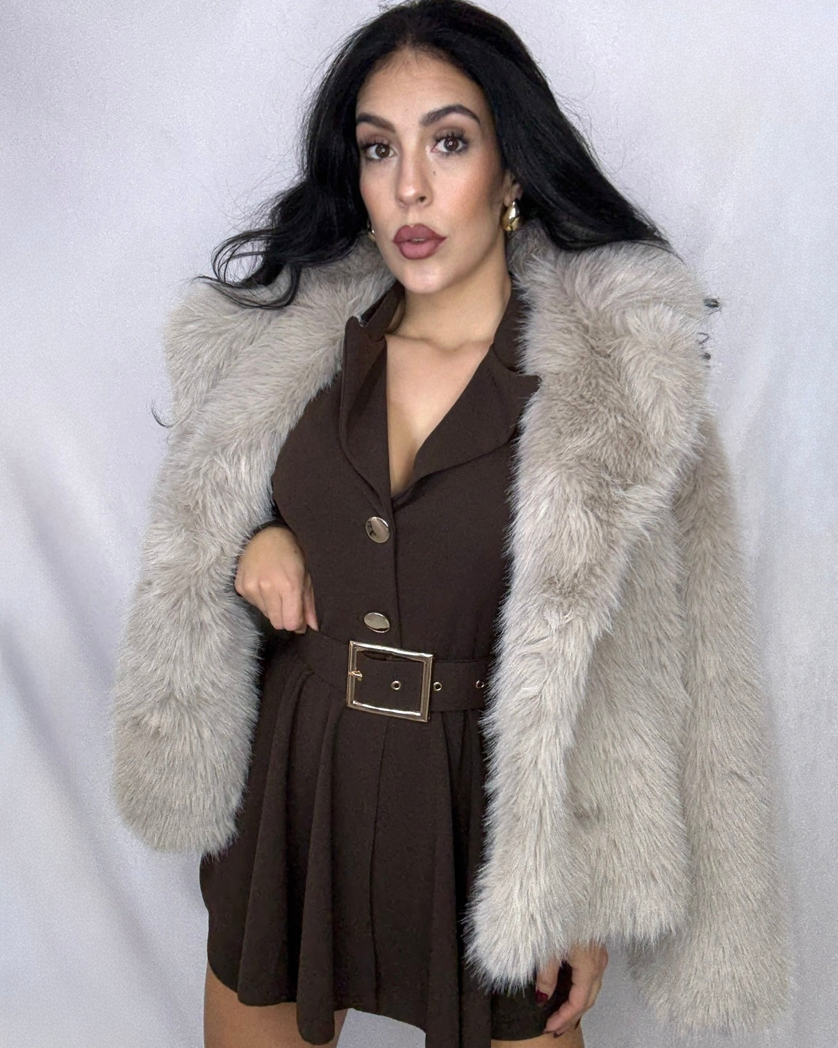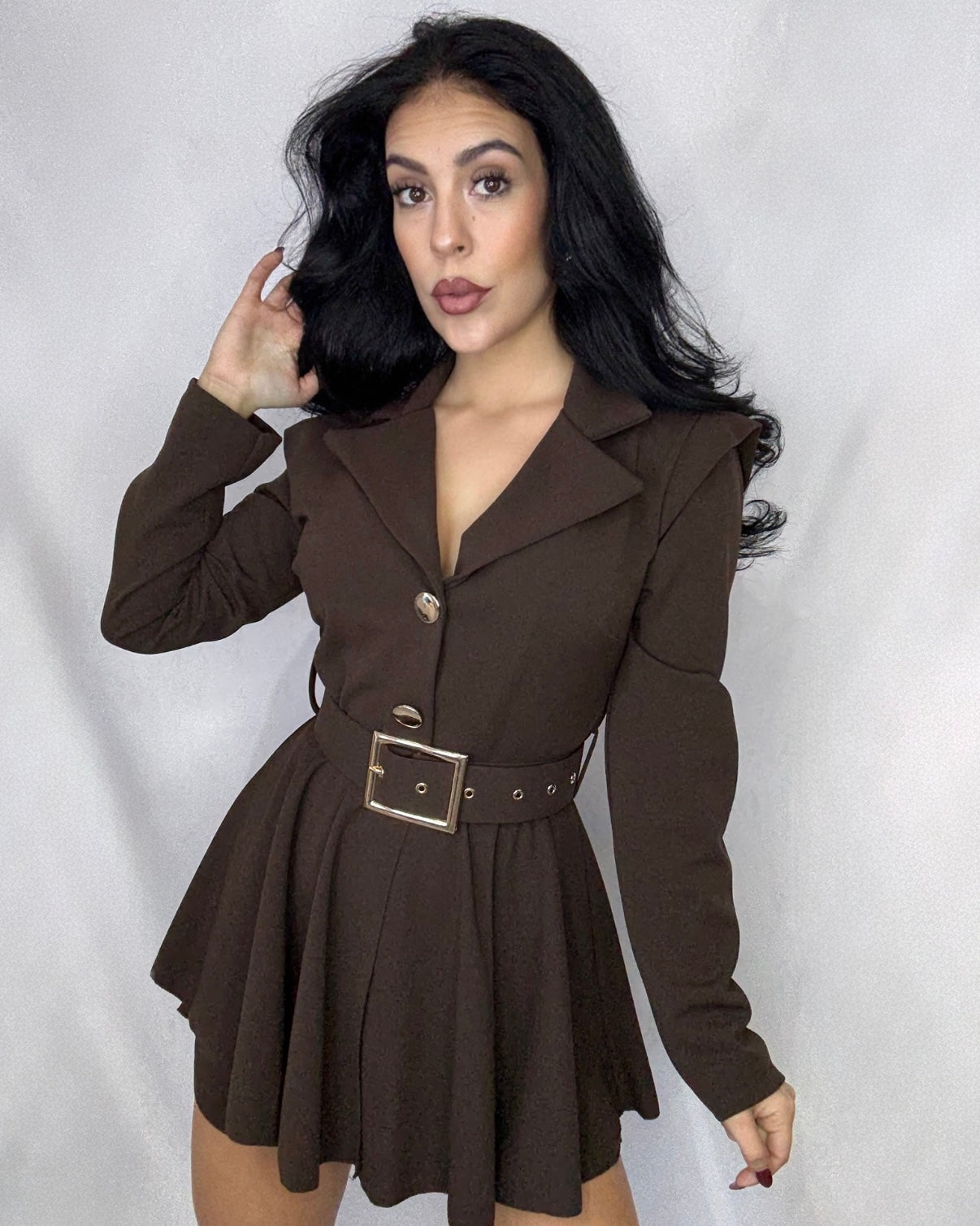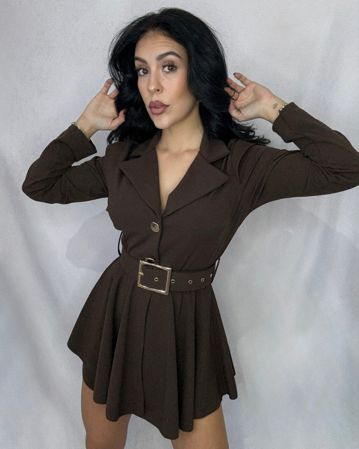Mono en talla única con detalle de botón dorado y cinturón incorporado.
