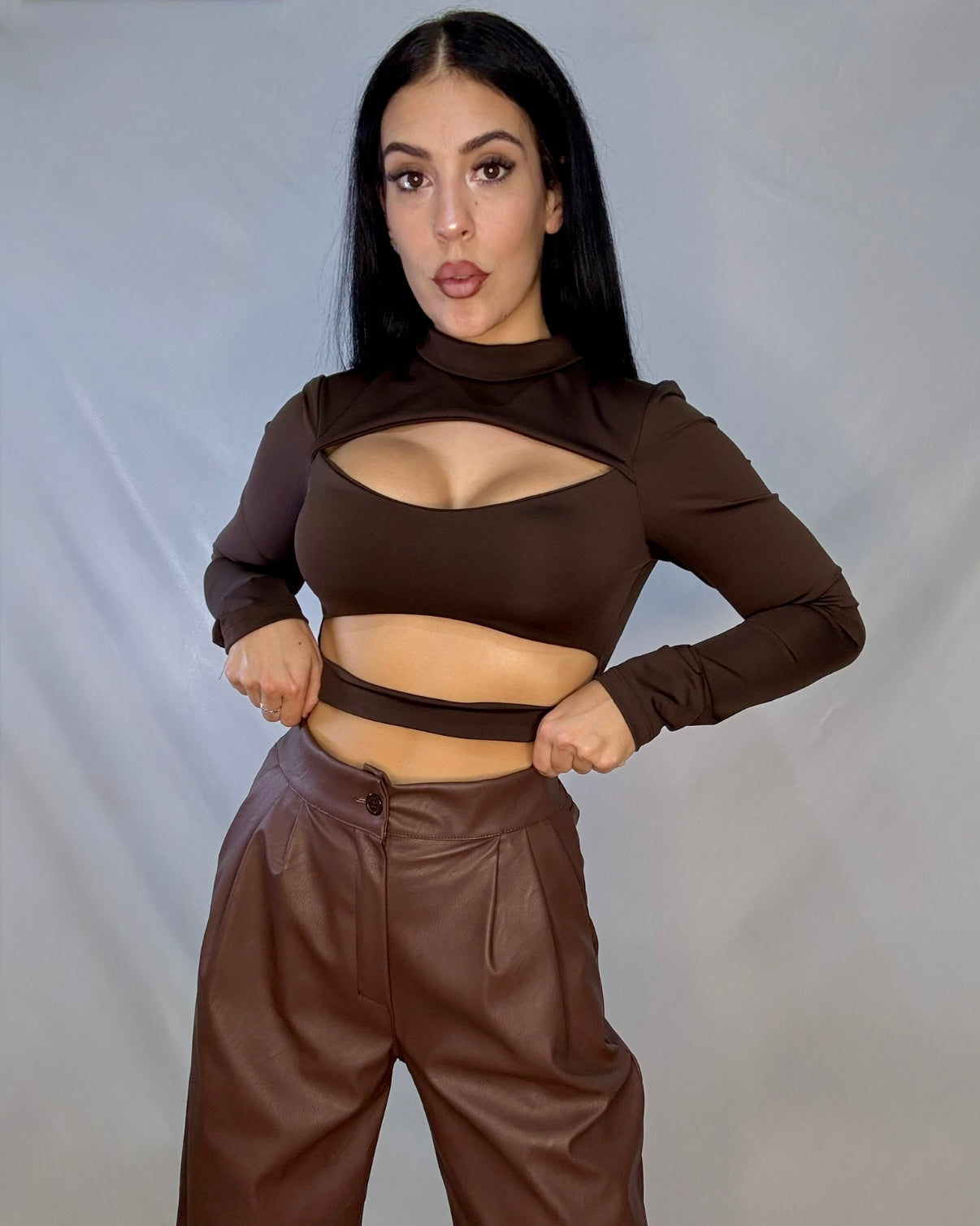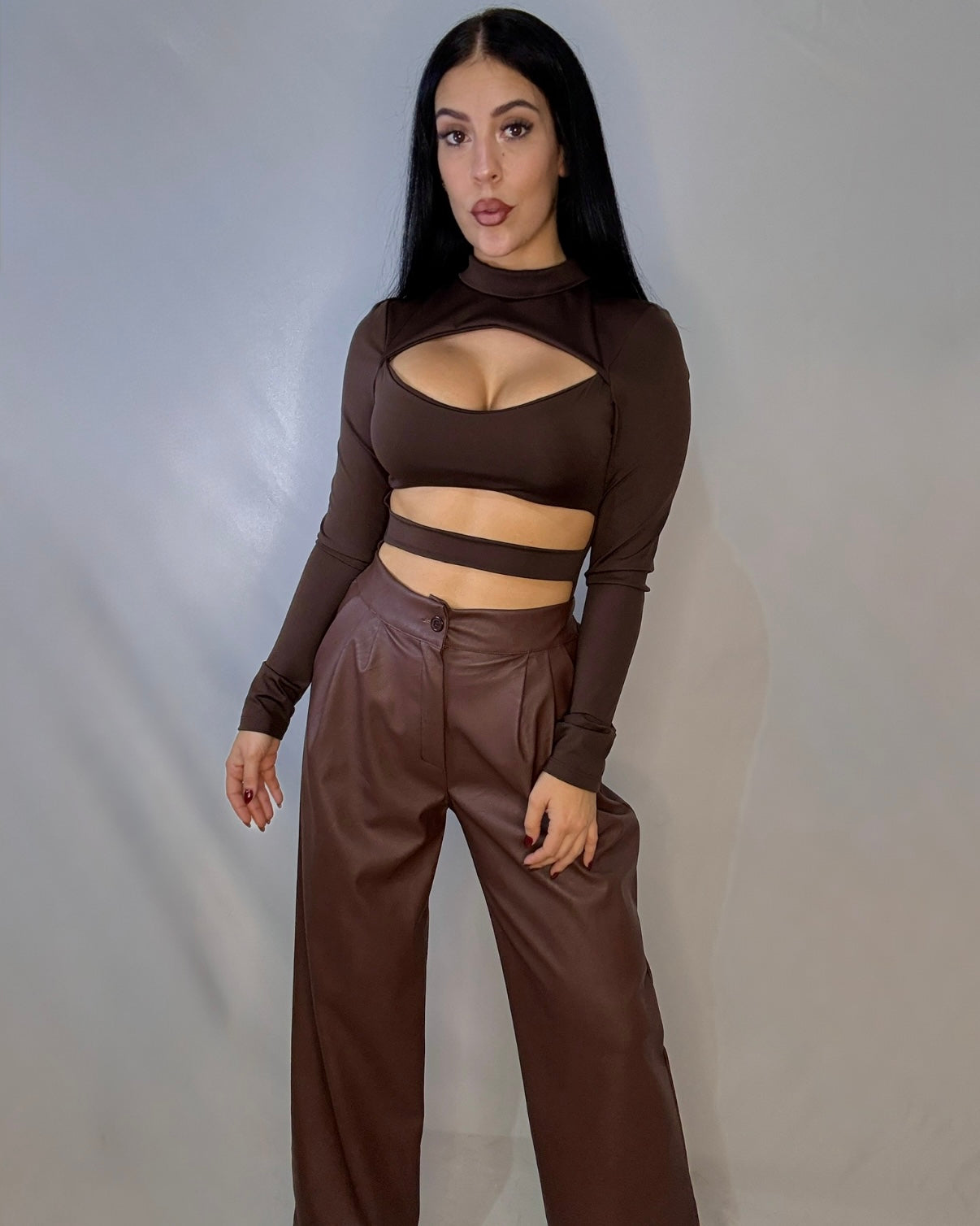 Pantalón polipiel recto con detalle de pinzas en la parte delantera y engomado en la parte trasera.