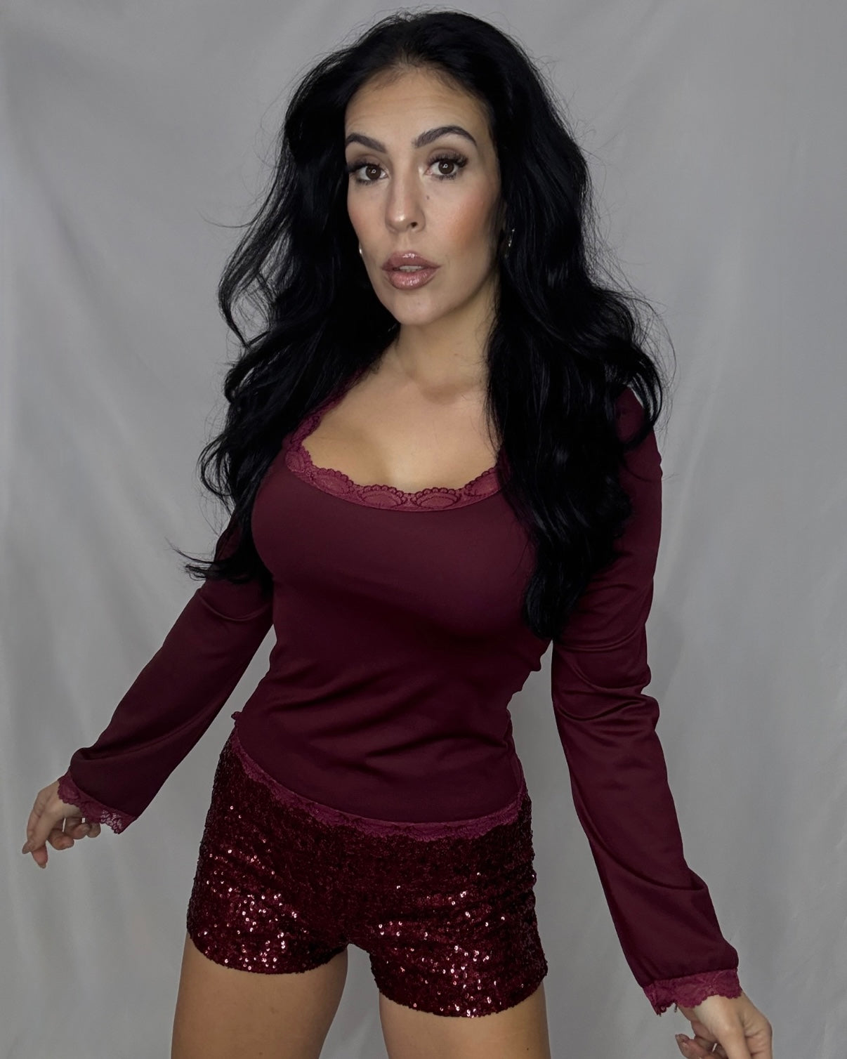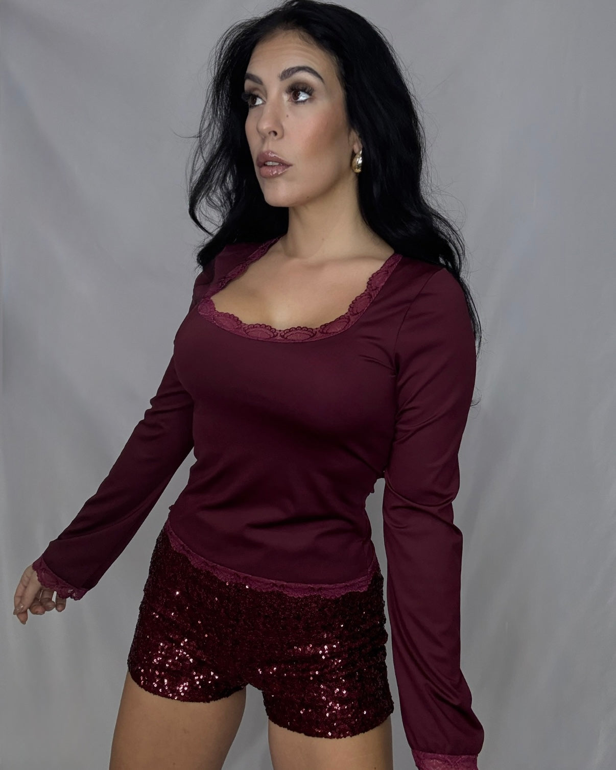 Top de licra fría con detalle de encaje en cuello, mangas y bajo.